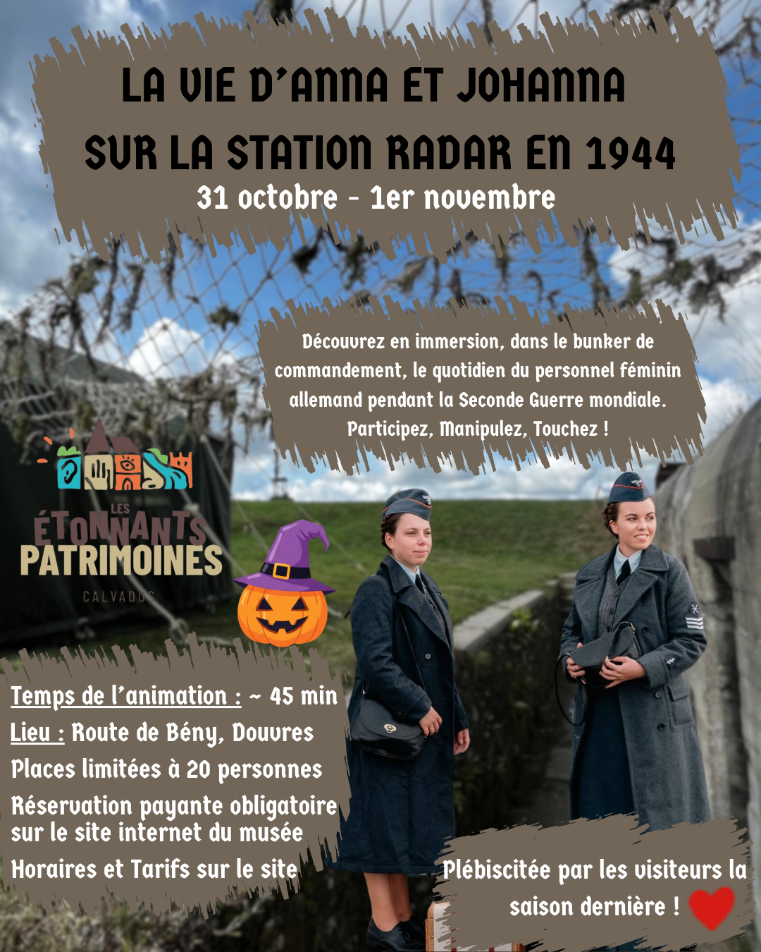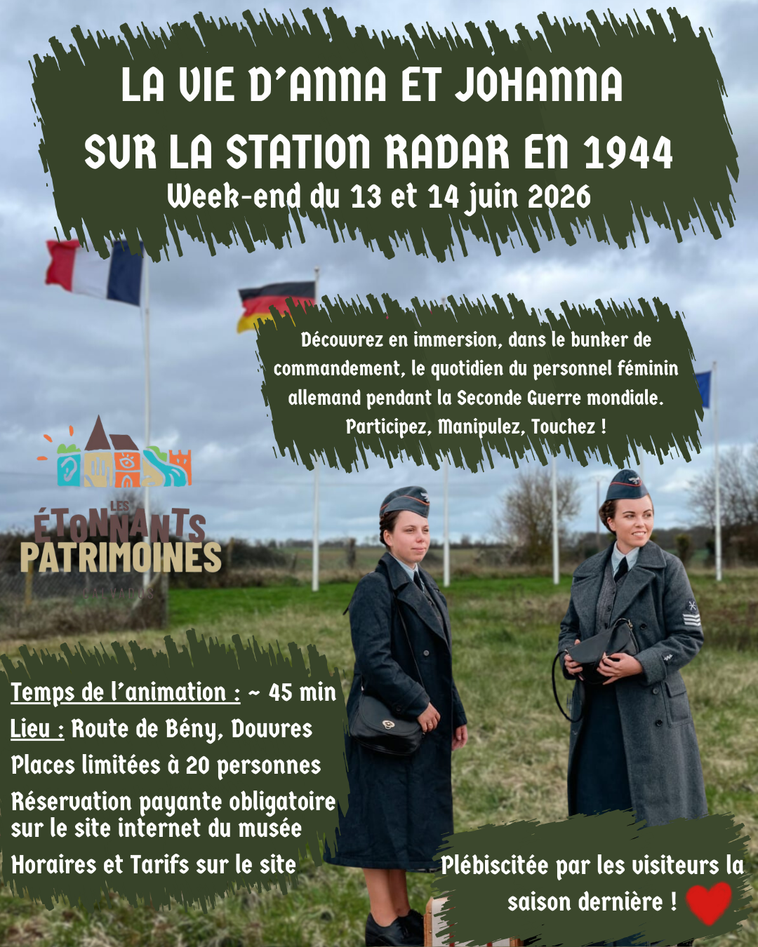 Venez en famille (enfants et parents) rencontrer Anna et Johanna, deux jeunes femmes de l'armée de l'air allemande (la Luftwaffe), présentes sur la Station Radar de Douvres-la-Délivrande en 1944.