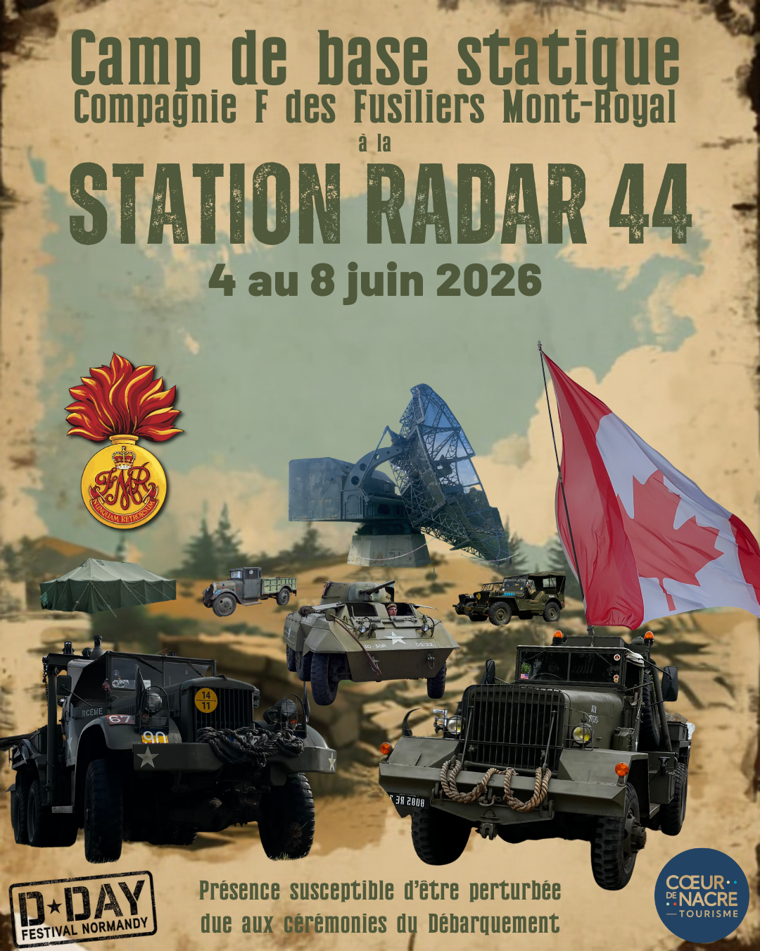 Retrouvez, pour notre plus grand plaisir, le campement de base de la Compagnie F du régiment honoraire des Fusiliers MONT-ROYAL, du 4 au 8 juin 2026 !